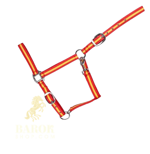 Leuke halster set in de kleuren van de Spaanse vlag. Perfect voor bijvoorbeeld Andalusiërs, PRE's of andere Spaanse rassen. De halsterset bestaat uit een sterk nylon halster en een zacht katoenen halstertouw van 2 meter lang.
