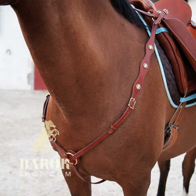 Elegant and stylish: that describes Lusitania breast collar! The breastplate is decorated with open flower ornaments and Portuguese buckles. Beautiful finish and the finest leather quality, these breast collars are handmade in Spain.