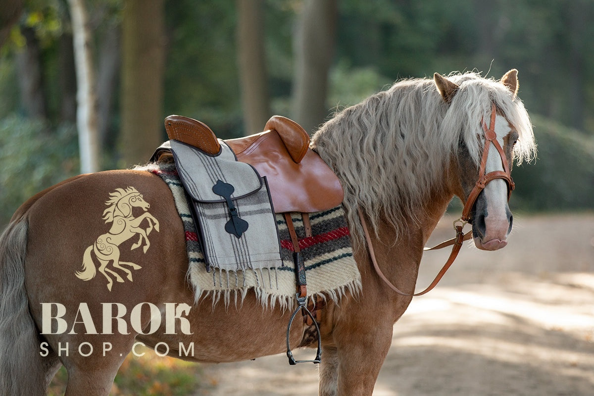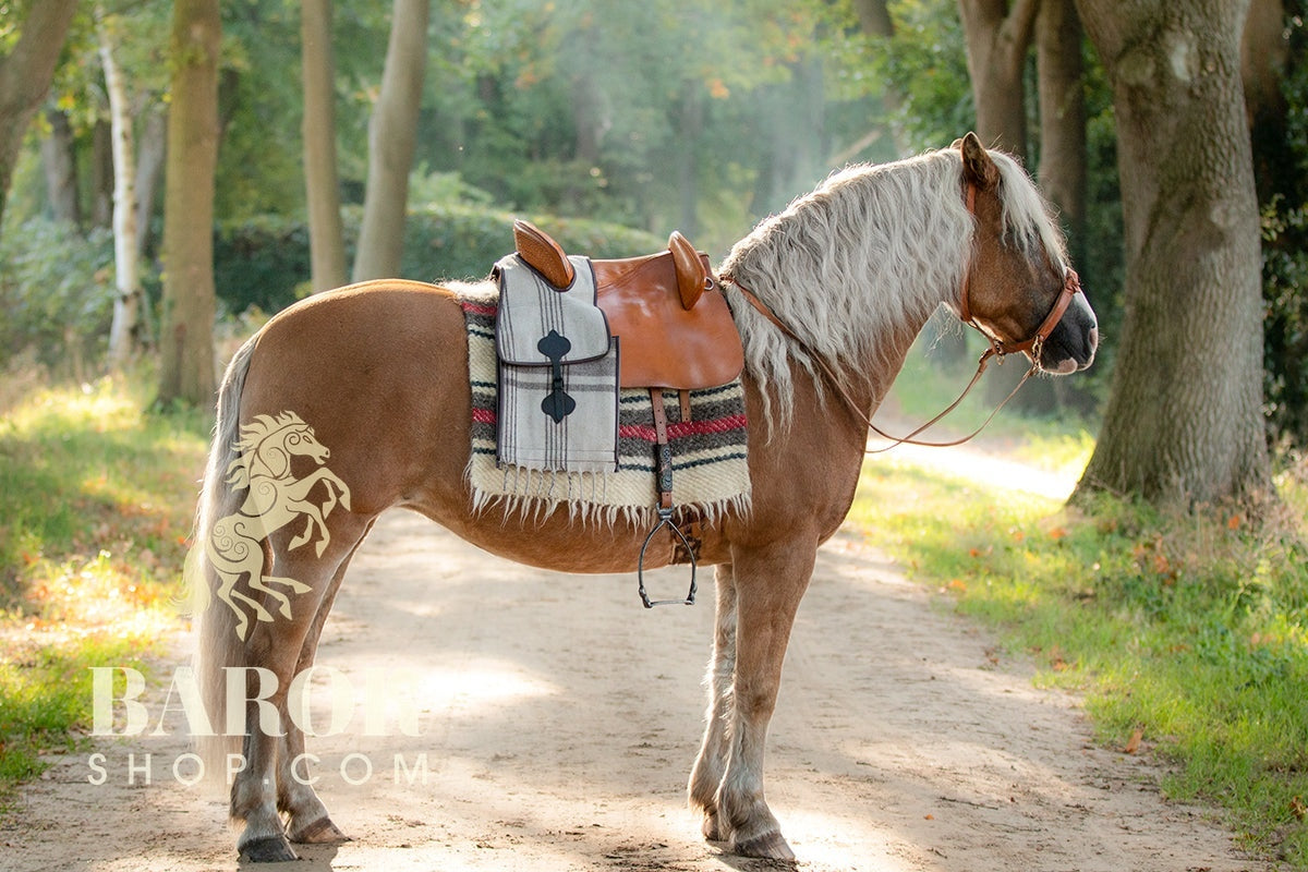 Beautiful saddle bag in traditional Spanish style made of 100% wool and finished with a leather trim. The buckles are also in Spanish style. The bag has a lot of storage space and is ideal for taking extra items such as food and drinks, first aid kit, extra halter and hoof pick on an outdoor ride.